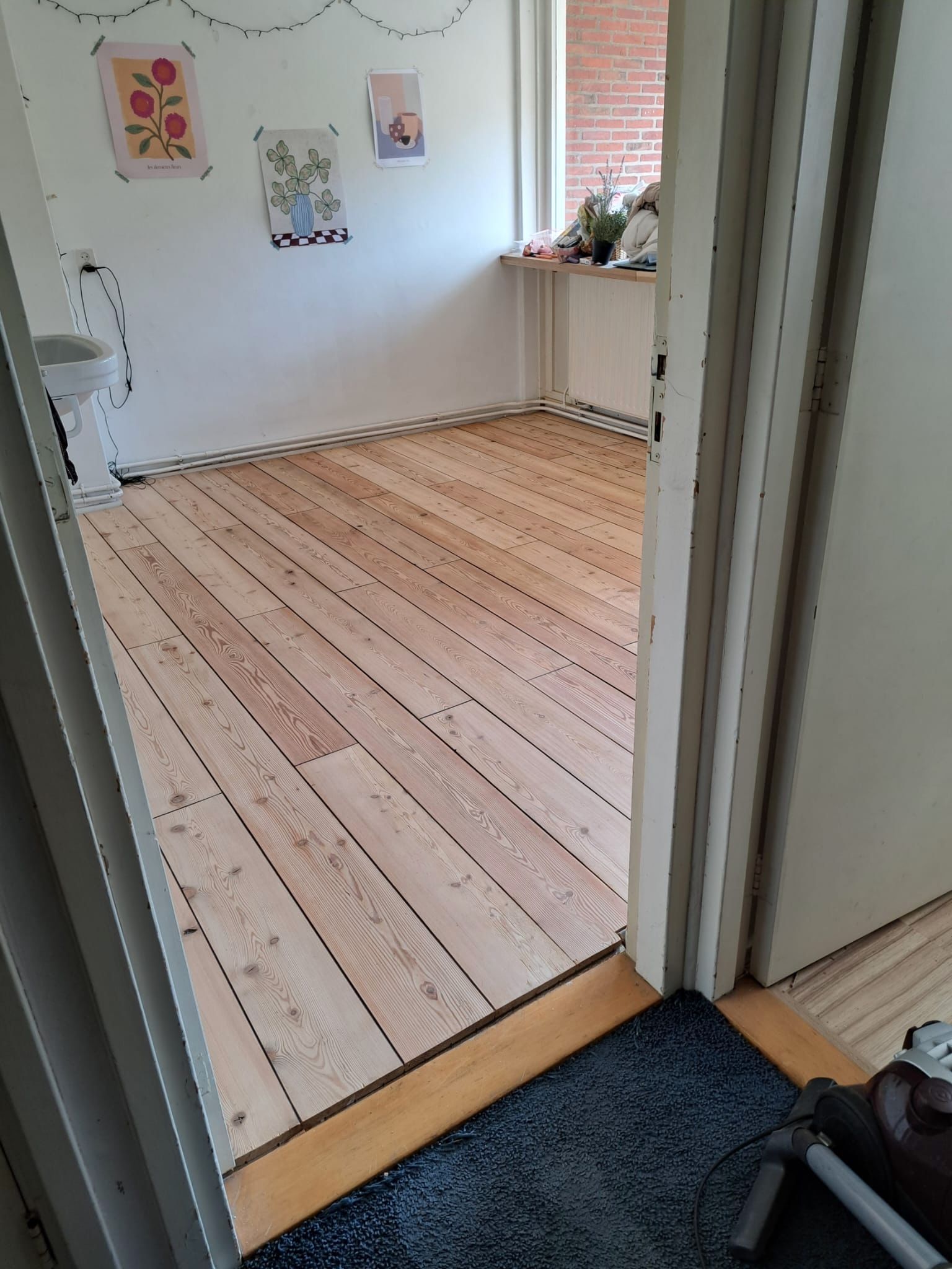 Oplossing:Deze houten vloer is aan een sloopproject overgehouden, dus stortkosten bespaard, en op een ander project weer neergelegd. Op locatie netjes afgeschuurd en in de lak gezet.
