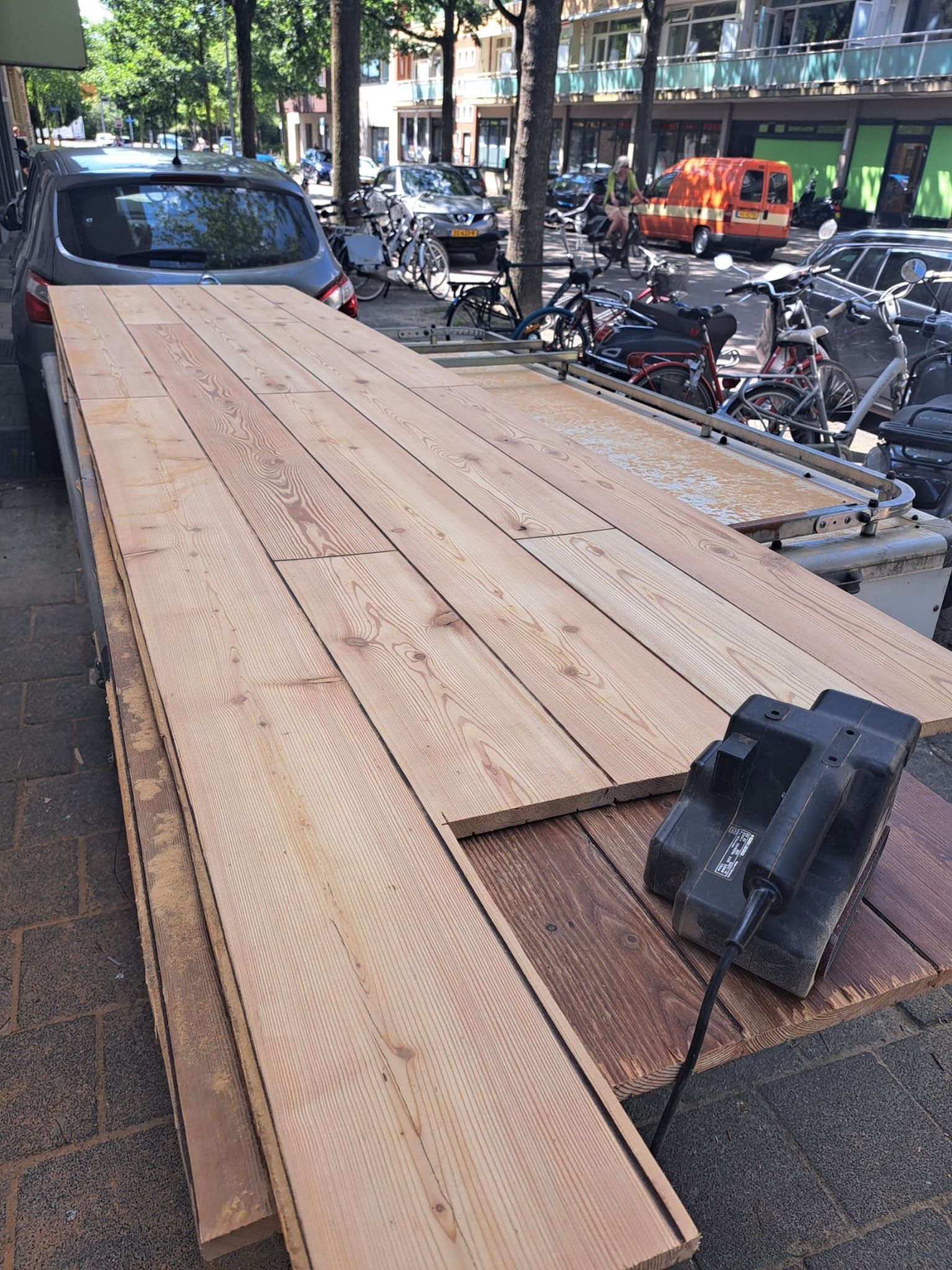 Project:Een afgedankte, splinterende houten vloer renoveren en opnieuw plaatsen op andere locatie.