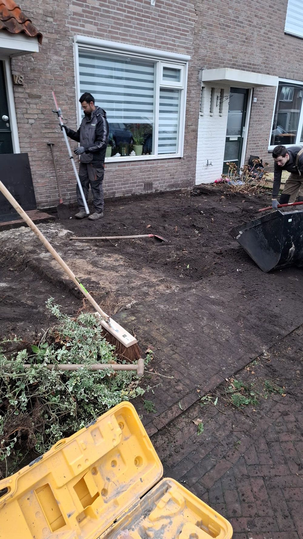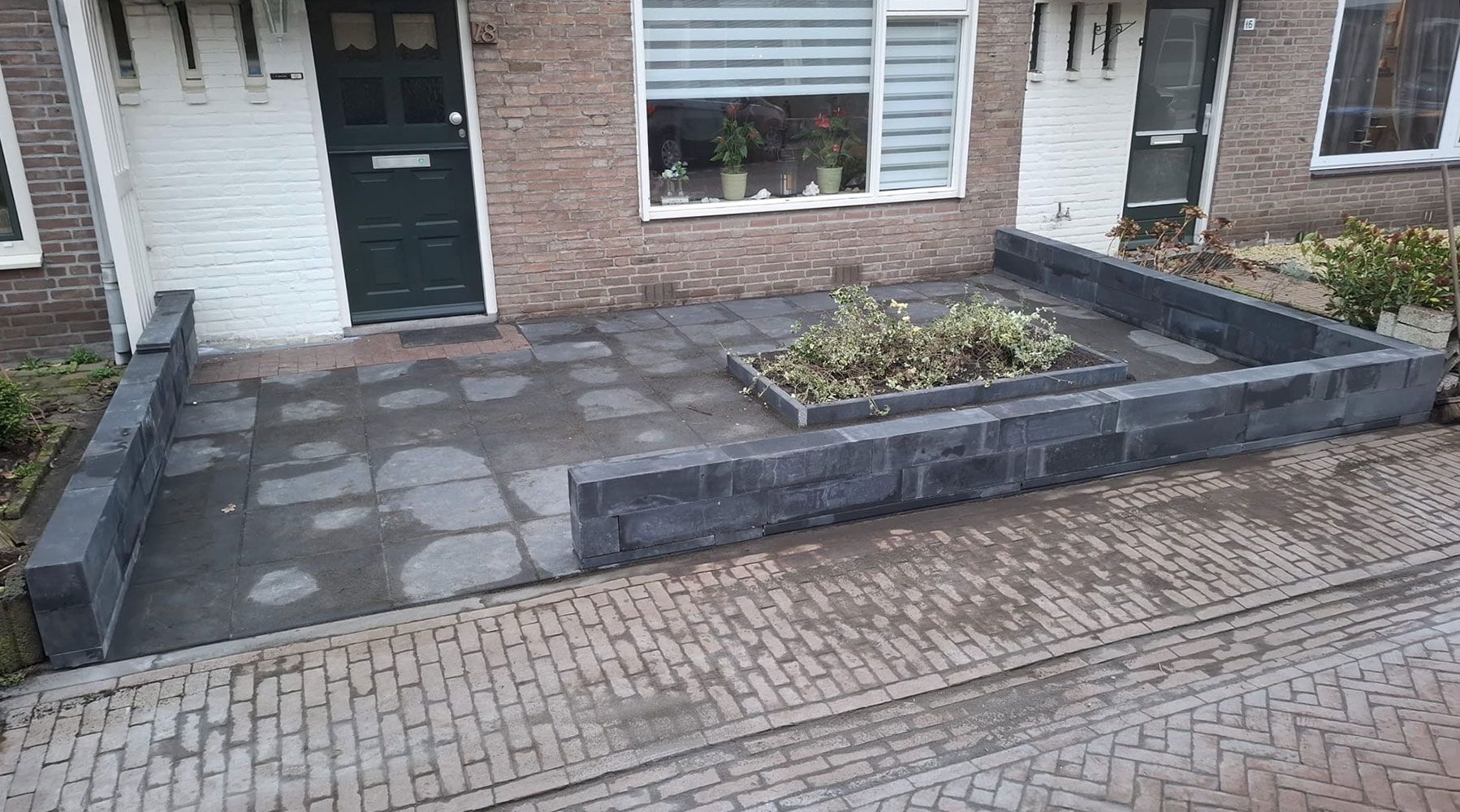 Oplossing: In een dag is alle begroeiing verwijderd, samen met de tegels. Er is een zandpakket geleverd en aangebracht, goed verdicht door in te wateren en te trillen. Daarna is een nieuwe verharding aangebracht en netjes ingevoegd. Er is gekozen voor grote tegels waardoor er weinig voegen zijn en onkruid weinig kans krijgt. Nadien zijn er nog stapelblokken om de tuin aangebracht met een aantal sparingen.
